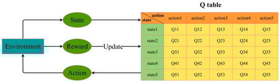 Reinforcement learning (RL) is a branch of machine learning that dictates how machines should behave in their current environment to maximize cumulative rewards. Within machine learning, there are three fundamental components: state, action, and reward [26]. Q-learning, first introduced by Watkins in 1989 [27], is a specific type of RL algorithm. Q-learning involves the creation and updating of a Q table, which guides the machine’s actions based on the current state. In some scenarios, the machine selects the action with the highest Q value from the Q table, updating the Q table during training. The updated policy is illustrated in Equation (6).