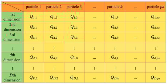 In the RLPSO algorithm, we randomly generate a (D × ps)-size Q table for each particle of the swarm. D is the number of particle dimensions; ps is the population size of the swarm. The Q table dictates from which particle’s pbest each dimension of every particle learns during each iteration. When updating each dimension of the particle, the particle with the highest Q value becomes the focal point of learning. In instances where the particle with the highest Q value is itself, the particle can still learn from its own past experiences. Each particle maintains its own Q table, as illustrated in Figure 3.