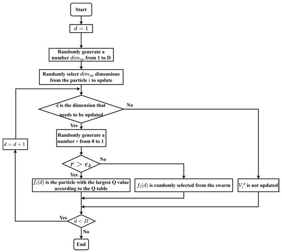 In contrast to the CLPSO algorithm, which relies on the fitness values of two randomly selected particles to determine learned particles, the RLPSO algorithm expedites this process by leveraging the Q table. The selection process of fi(d) for the particle i is shown in Figure 4. Simultaneously, we update the Q table of particle i in response to rewards or penalties incurred during the updating of gbest and pbest. If the dimension that requires updating is denoted by d, we update Qd,fi(d) in accordance with Equation (7). Otherwise, no updates are made. We repeat this process from d = 1 until d = D, resulting in the complete update of particle i’s Q table.
