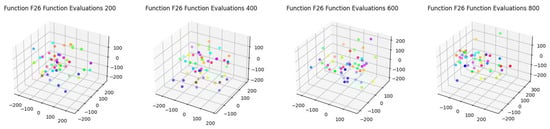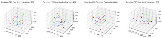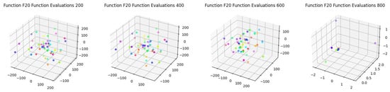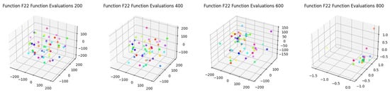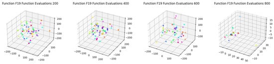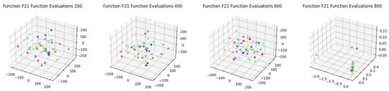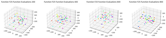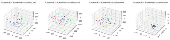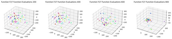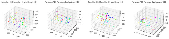 From Figure 8, Figure 9, Figure 10, Figure 11, Figure 12, Figure 13, Figure 14, Figure 15, Figure 16, Figure 17, Figure 18, Figure 19 and Figure 20, it is evident that the algorithm continues to improve beyond 600 function iterations and does not reach convergence. For certain functions (f17, f18, f25, f26, f28, f29), convergence is not achieved even after 800 function evaluations. Furthermore, the comparisons across different runs highlight the algorithm’s stability for these functions.