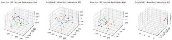 From Figure 21, we can observe that the exploitation% of the algorithm starts to increase around the 400th iteration. For f20 and f23, when the number of iterations reaches 800, the exploitation% nearly approaches 100%. This observation is consistent with what is shown in Figure 11 and Figure 14, where the particles are in a clustered state. The data in Figure 21 indicate that as the number of iterations increases, the algorithm’s performance gradually improves and eventually stabilizes. This suggests that in the later stages of the algorithm’s execution, the clustering of particles significantly enhances the exploitation rate, reaching nearly full exploitation.