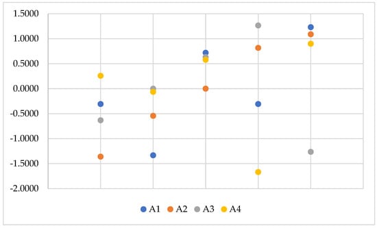 Now, we do the defuzzification (Equation (3)) of the aggregated values as follows. Table 1 shows the score values obtained after defuzzification.