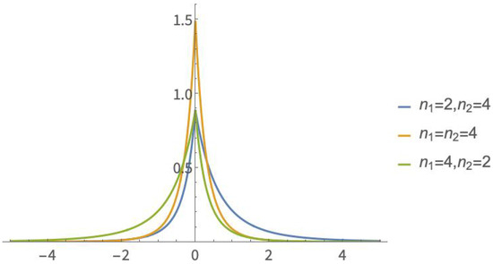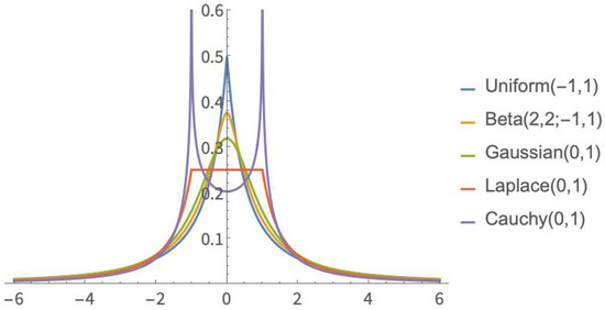The graphics in Figure 1 show that the probability density function of with a non-Gaussian parent can be quite different from that of , i.e., with a Gaussian parent. Note that with a parent and a parent, the corresponding densities of are unimodal and have heavier tails than those of (see Figure 2). In the case of a Cauchy parent, which is known for having very heavy tails, has an antimodal probability density function. The observation that heavier tails of the underlying parent distribution result in less heavy tails for the distribution of Student’s T-statistic, and vice-versa, was proved by van Zwet [16,17]. This indicates that the tail weight of the distribution is very important to determine the conservative or liberal behavior of Student’s statistic.