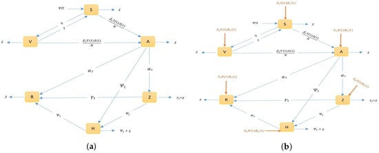 In Figure 9a,b, both model (1) and (2) are shown with and without control factors. The difference in the graphs is clearly visible. This shows that the control factors have a significant effect on the spread of the disease.