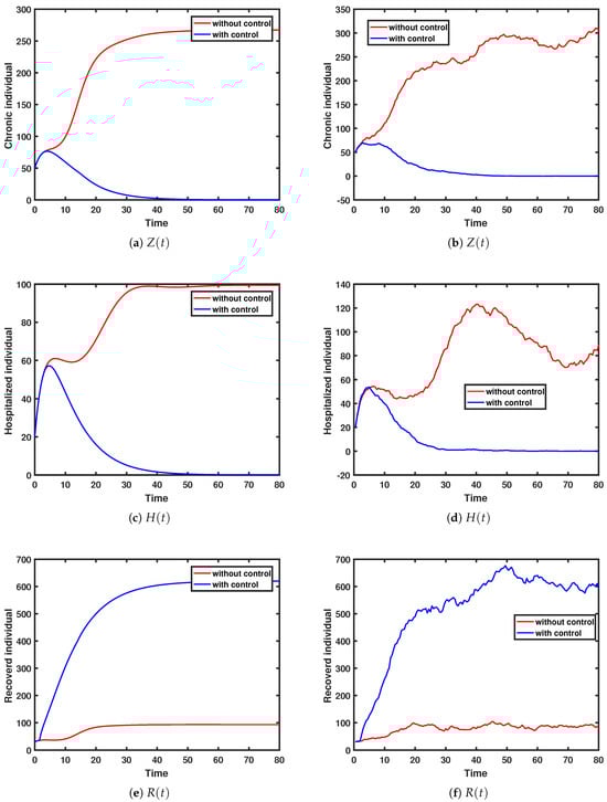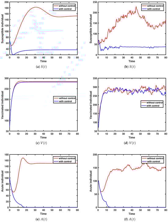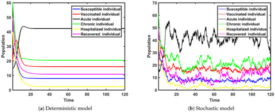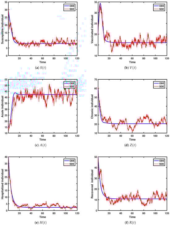 There are independent Gaussian stochastic variables that follow a normal distribution, namely . In addition, (for ) represents the intensity levels of the white noise. Let us assume that time steps have a size of . The stochastic model will be simulated using MATLAB using the algorithm outlined in (80). A deterministic model will be simulated using the conventional Runge–Kutta fourth-order (Rk4) algorithm. The following sections of the manuscript present the graphical outcomes of the simulations. The following section will present a graphical illustration of the model’s long-term behavior. Moreover, we will demonstrate how manipulating the values of specific sensitive parameters within the model can affect the disease dynamics.