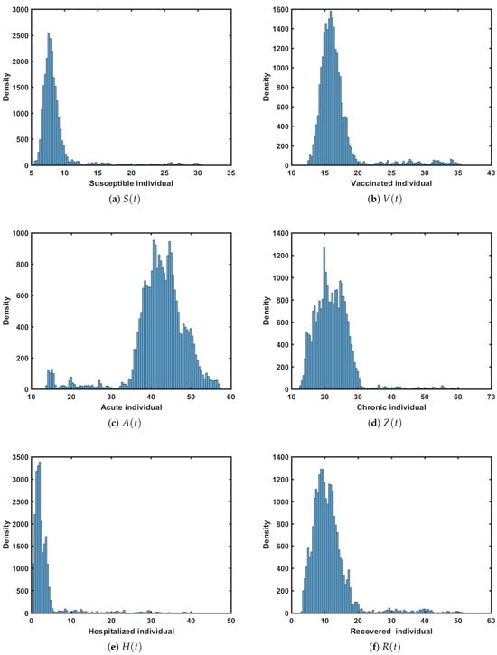 The proposed stochastic model should have a unique stationary distribution; we will examine an alternative set of parameters [16]: , , , , , , , , , , , , and . In this scenario, the white noise intensities are set as , while the initial data for each compartment remain the same as in Section 7.2. In using these parameter values, the threshold parameter for the deterministic model was computed to be . The value of plays a crucial role in assessing the stability of the model’s endemic equilibrium point . If exceeds one, it can be inferred that is globally asymptotically stable. From the data presented in Figure 3a–f, it can be deduced that the infection will persist and spread throughout the population if exceeds 1. Using the parameters in the model (1), we found that , which is above the threshold of one. This observation indicates that the simulations are consistent with the conclusions outlined in Theorem 3. The curves show slight variations around their corresponding endemic equilibrium points in this scenario due to the small white noise intensities. This indicates that the disease will persist in the population for an extended period. Theorem 3 provides analytical evidence of the existence of an ergodic stationary distribution, further supported by the numerical results shown in Figure 4. Additionally, we created a frequency distribution histogram using the bootstrap-estimated values for each compartment, revealing the consistent persistence of the disease. Therefore, implementing more effective prevention and control measures can only eliminate the condition.