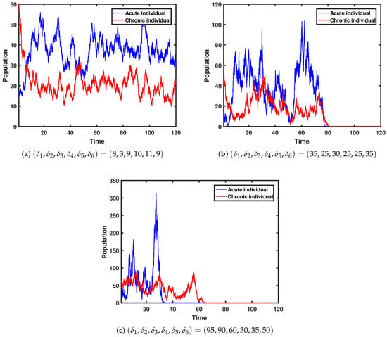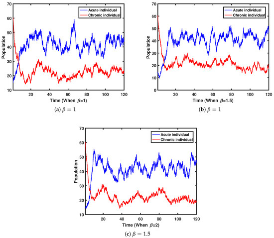 We conducted simulations to show how affects the dynamics of the infected classes. Specifically, we looked at three values of : 1, 1.2, and 1.5. Alongside other parameters outlined in Section 7.2, we used stochastic noises The results of the simulations are visually presented in Figure 5, where we compare the stochastic model and its deterministic counterpart. The graphs in Figure 5a–c show that as decreases, the populations converge more quickly toward disease extinction. Therefore, lowering the values is necessary to achieve disease extinction. A better understanding of HBV dynamics requires incorporating nonlinear stochastic noises.