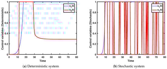 To simulate model (1), the stochastic ‘RK4’ technique was used. The optimal solution was found by evaluating approximate adjoint equations and considering transversality conditions. The first step involved solving state system (74) using the RK4 scheme. Then, for the adjoint equations, we use a backward technique to elevate system (74). The conditions of transversality (75) were also taken into consideration.