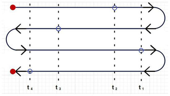 Here, represents the time-ordering symbol. For out-of-equilibrium systems like the inverted oscillator, although we need to compute such correlators, we cannot use time-ordering and hence must use some other kind of formalism. The Schwinger–Keldysh contour facilitates refining to a time-folded contour and hence provides a path integral representation of the out-of-time-ordered correlators. In Figure 1, the four legs are denoted by each time stamp and we have taken the past-turning point in the contour at time and future-turning point at certain time t. Now, for the action of an operator, e.g., at , at a later time , it must be related by the usual Heisenberg evolution with unitary time evolution operator , i.e.,