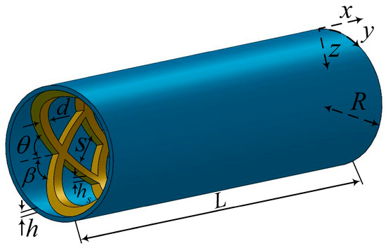 The configuration of the MFG cylindrical shells reinforced by FGSSs is illustrated in Figure 1. The dimensions of cylindrical shells, such as thickness (), radius (), and length (), and the characteristics of the stiffeners, including width (), angles (), thickness (), and spacing (), are specified.