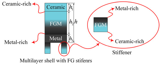 In the current research, the MFG cylindrical shells reinforced by FGSSs have three layers, which are revealed in Figure 2. The outermost layer of the shell is composed predominantly of ceramic, the innermost layer primarily of metal, and sandwiched between these is a layer of functionally graded material (FGM).