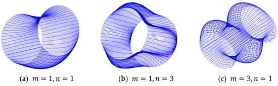 In this research, we give priority to the lower frequency modes over the higher frequency modes when examining the NVs of MFG cylindrical shells that are strengthened by FG spiral stiffeners and have simply supported boundaries [28,29]. It should be explained that the prioritization of lower frequency modes over higher frequency modes is due to their significant influence on the system’s overall dynamic response, especially in terms of transverse nonlinear oscillations. Lower frequency modes typically dominate the response of cylindrical shells under various loading conditions, providing fundamental insights into the shell’s behavior. The analysis concentrates on these modes in order to efficiently capture the most important features of nonlinear dynamic behavior, which are frequently connected with the most noticeable consequences in practical applications. Our study primarily investigates the system’s transverse nonlinear oscillations across the initial three modal orders. We opt for a mode function, expressed as , that adheres to the necessary boundary conditions. Here, and . Also, represents the count of longitudinal modes, and denotes the count of transversal modes. Consequently, we focus on the first three orders of vibration modes, assuming an approximate solution based on these parameters.