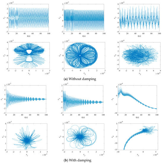The impact of the damping coefficient on the waveforms and the phase diagrams of the NVs of MFG cylindrical shells reinforced by FGSSs, featuring subharmonics of order 1/2 and 1:2:4 internal resonances, is depicted in Figure 4. The vibration amplitude of the system, considering the first three order modes, is decreased. As can be seen, the velocity for the modes () is lower than for others. Also, the maximum deflection versus velocity curve of the MFG cylindrical shells reinforced by FGSS with the modes () becomes more disordered.