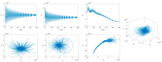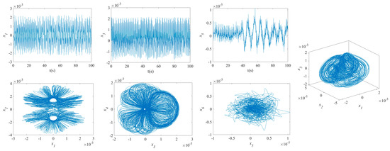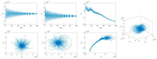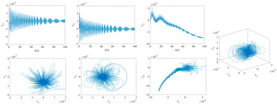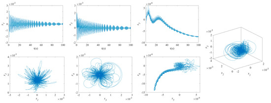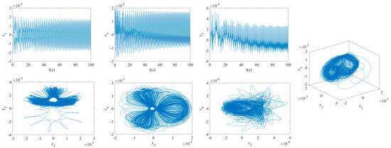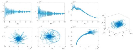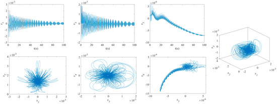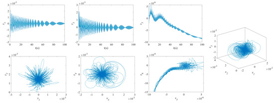 The influence of symmetric or asymmetric angles of stiffeners on the waveforms and phase diagrams of NVs in MFG cylindrical shells reinforced by FGSSs, featuring subharmonic orders of 1/2 and internal resonances of 1:2:4, is illustrated in Figure 5, Figure 6, Figure 7, Figure 8, Figure 9, Figure 10, Figure 11, Figure 12, Figure 13 and Figure 14. According to these figures, the maximum deflection versus velocity curve of the MFG cylindrical shells reinforced by FGSSs for modes () and () becomes more disorderly with the stiffener’s angle or . On the contrary, for modes (), the curves become less disorderly when the stiffener angle or . Notably, the vibration amplitude and velocity of the system with the first three-order modes are highest at the stiffener angle . Furthermore, the vibration amplitude of shells for modes () with stiffener angles or and , as well as those for modes () with stiffener angles and , is lower than others. Shells with modes () exhibit this trend at stiffener angles and or and or and . Conversely, the velocity is lower for modes () at and , for modes () at and or , and for modes () at and or or . The phase plane of the vibration of MFG cylindrical shells reinforced by FGSSs for modes (m = 3, n = 1) with stiffener angles and quickly trends towards a limit cycle, thereby rapidly stabilizing the NVs of the system.