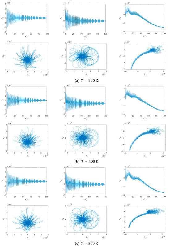 Figure 15 illustrates the impact of temperature on the NVs of MFG cylindrical shells reinforced by FGSSs, featuring subharmonic orders of 1/2 and internal resonances of 1:2:4. As shown in this figure, increasing the temperature increases the disorder in the maximum deflection versus velocity curve of the MFG cylindrical shells reinforced by FGSSs for the modes () and (). However, an increase in temperature slightly decreases the vibration amplitude for the modes ().