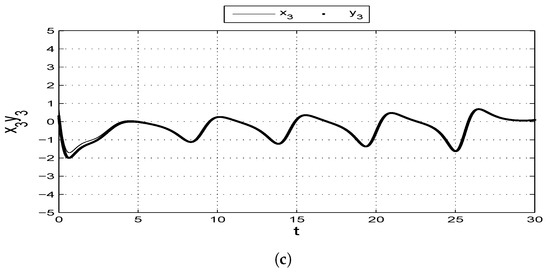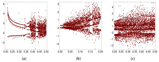 The bifurcation diagrams are plotted by varying the parameters. Let . These bifurcation diagrams of the chaotic system, depending on changes in parameters a, b, and c, are displayed in Figure 5a–c. Figure 5a–c are plotted with parameters versus . At , the Lyapunov exponents of the satellite system are computed, and the results are shown in Figure 6. Figure 7 also displays the feedback control of the fractional derivative chaotic satellite system when control is initiated at . The tracking trajectories of the slave to master fractional derivative satellite system with order are shown in Figure 8a–c for , , and , respectively.