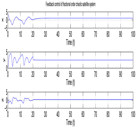 Equilibrium Points: The equilibrium point of the dynamical system with fractional order derivative is the same as that of an integer-order dynamical system [23]. By solving the system of equations below, the satellite system’s equilibrium points (16) can be determined;