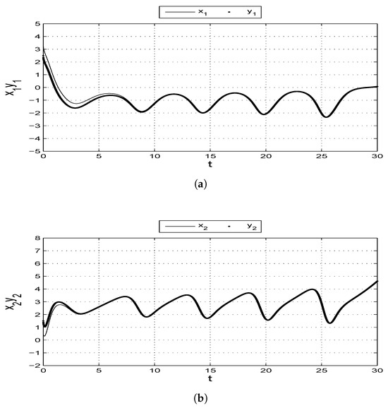 For the satellite system in Equation (16), two identical master (drive) and slave (response) systems are rebuilt in the form of x and y subscripts, respectively: