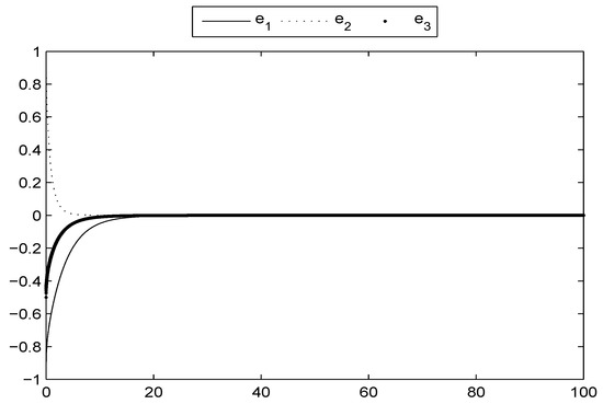 At the initial condition of the error system , Figure 9 illustrates the synchronization of the fractional derivative error dynamics, represented by the evolution of , , and with respect to time t. As time progresses, the figure reveals how the error terms between the master and slave satellite systems gradually diminish and approach zero, signaling that the synchronization process is effectively taking place. The distinct trajectories of , , and highlight the convergence behavior and the stabilization of the system’s chaotic dynamics through the applied control methodology.