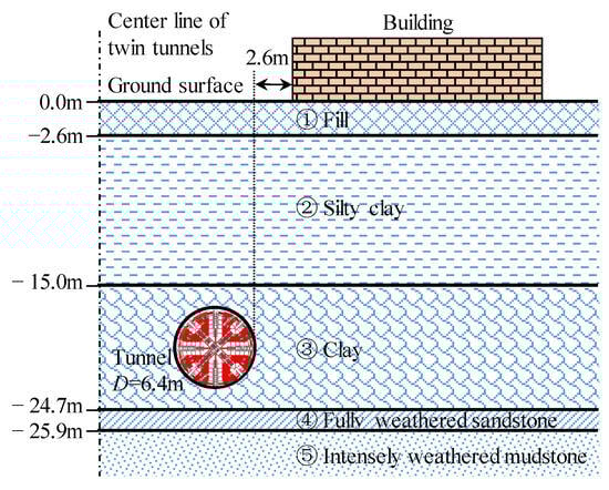 A twin metro tunnel excavation in Changchun constructed using an EPB shield with a diameter of 6.4 m was chosen as the subject for a detailed case study and subsequent numerical simulation. As depicted in Figure 1, the tunnel is close to an existing single-storey brick–concrete mixed structure building with a length of 48 m. The distance between the outer edge of the tunnel and the building is a mere 2.6 m. The soil covering the tunnel has an approximate thickness of 16.6 m.