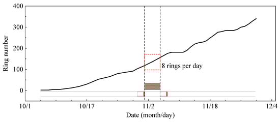 The terrain in this area is relatively flat. Based on drilling data, the soil layers within the project’s investigation zone have been carefully categorized into several main types: fill, silty clay, clay, fully weathered sandstone, and intensely weathered mudstone. The groundwater table is shallow, primarily replenished through lateral seepage and flow. Figure 1 illustrates the schematic layout of the project and the spatial relationship between the tunnel and the building. Figure 2 shows the progress curve for the metro tunnel excavation, which took four days to traverse the building at an average rate of approximately eight rings per day.