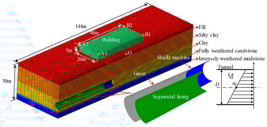 Previous studies have frequently utilized the element death technique to model tunnel excavation processes [37,38]. To study the effect of tunnelling on the behaviour of the building, a staged construction process was considered in a numerical simulation. The initial stresses of the soil were established using the in situ stress values and soil parameters detailed in Table 1 to ensure the soil was in equilibrium with the gravitational forces and did not experience any initial deformation. The process of tunnel excavation and support was simulated by deactivating the soil elements and concurrently activating the lining and grout elements. Subsequently, the tunnel excavation and support processes were simulated through the deactivation of the soil elements and the activation of the lining and grout elements. The influence of the tunnelling speed on the void pressure was considered. The length of the excavated section at each step was 1.5 m, completed over 3 h. The linear distribution of the face support pressure (σt) from the soil in the chamber was considered. The face support pressure exerted by the soil in the chamber was assumed to have a linear distribution [39]. The gradient of the support pressure was set as 20 kPa/m based on the results of soil pressure monitoring. The face pressure at the tunnel face’s centre was determined to be 192 kPa, as derived from the initial stress analysis.