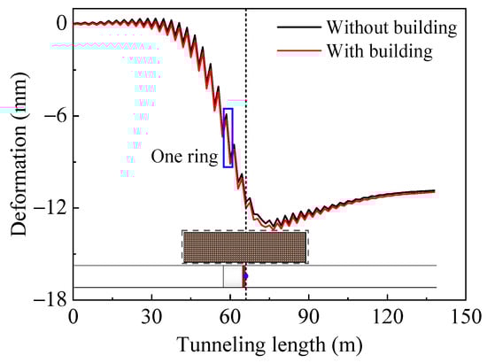 A settlement contour that incorporates the adjacent building is presented in Figure 4. It reveals that the building falls within the influence range of the shield excavation. The settlement at the midpoint directly above the tunnel (point O in Figure 3) is discussed in detail. The settlement time-history curves under conditions with and without the adjacent building are compared in Figure 5. They demonstrate that each excavation ring induces a disturbance at the monitoring point, manifesting as a trend of a decrease in the initial settlement followed by an increase. Surface settlement fluctuations are attributed to the accumulation of pore pressure within the stratum, which is caused by the action of the face support forces during the excavation process. This accumulation leads to a reduction in the effective stress in the soil body. As the pore pressure gradually dissipates, the stratum experiences an increase in settlement. Consequently, the settlement trends for the adjacent building exhibit corresponding fluctuations. However, a slight increase in surface settlement occurs due to the influence of existing buildings.