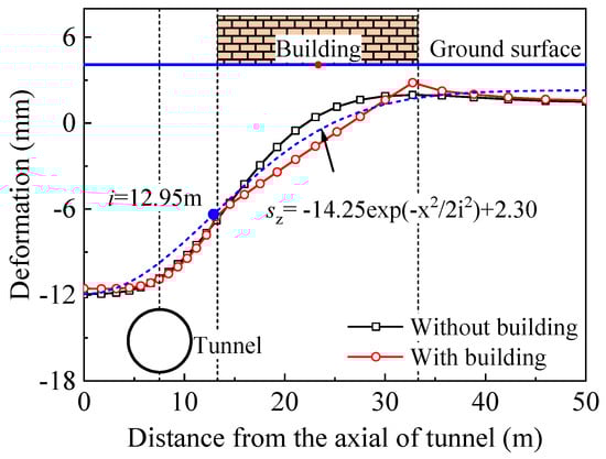 The settlement troughs for the section in which point O is located both with and without the presence of the building on the surface are compared in Figure 6. The empirical formulation developed by Peck [40] and its revised versions are commonly employed to depict transverse settlement. The settlement trough is typically assumed to follow a Gaussian distribution curve, given by the following equation: