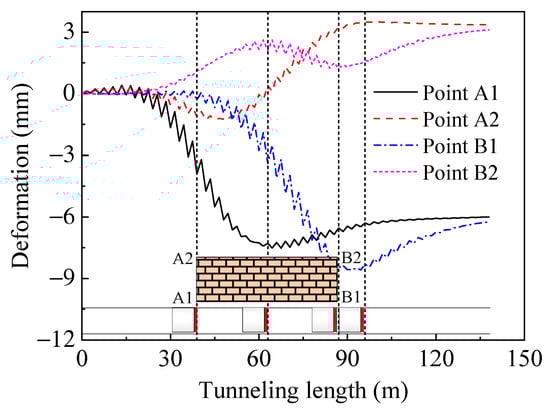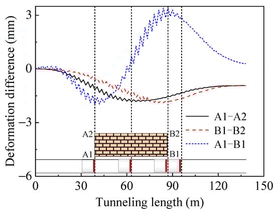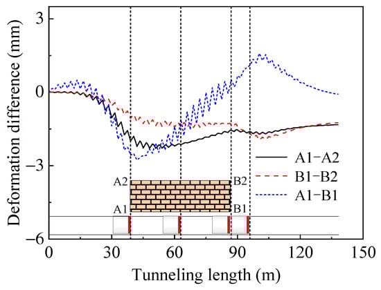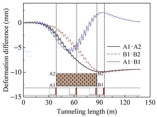 The settlement development curves for the four corner points of the building (points A1, A2, B1, and B2 in Figure 3) are depicted in Figure 7. Points A1 and B1, which are closer to the tunnel, exhibit settlement due to strata deformation from shield tunnelling. In contrast, point A2 initially settles but then experiences an uplift, while point B2 shows an initial uplift followed by a slight settlement. The differential settlement observed reflects the safety of the structure during the shield construction. As illustrated in Figure 8, transverse differential settlement increases with the tunnelling progress, reaching approximately 10 mm. Longitudinal differential settlement rises initially and then decreases, peaking when the shield is directly beneath the building. It becomes more uniform as the shield moves away. Continued shield advancement causes further settlement at point B1, increasing the longitudinal settlement in the opposite direction. With the building’s long longitudinal span, the maximum longitudinal settlement-to-length difference ratio is about 1.25 × 10−4, while the transverse settlement-to-width difference ratio is approximately 5 × 10−4.