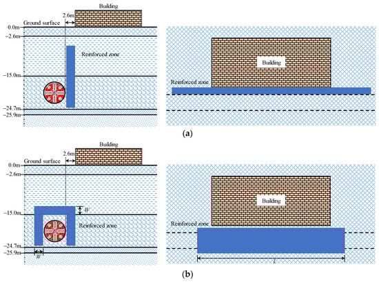 The portal partition method (Measure B) was proposed as an alternative reinforcement measure for controlling deformation in adjacent buildings. This method can also be implemented using a sleeve valve tube. As shown in Figure 9b, the vertical reinforcement zone is deposited 0.6 m from the tunnel structure’s exterior. The horizontal reinforcement zone is placed 1.6 m from the exterior, coinciding with the upper boundary of the clay layer. The length and thickness of the reinforced area were considered to investigate the effect of the tunnel excavation on the ground and building responses.