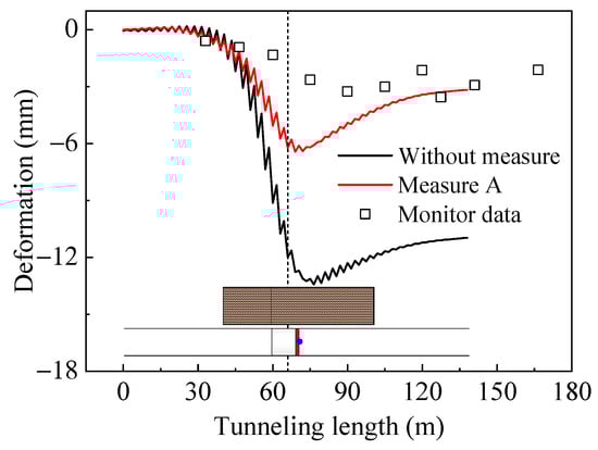 Comparison of settlement at point O above the tunnel axis with different measures.