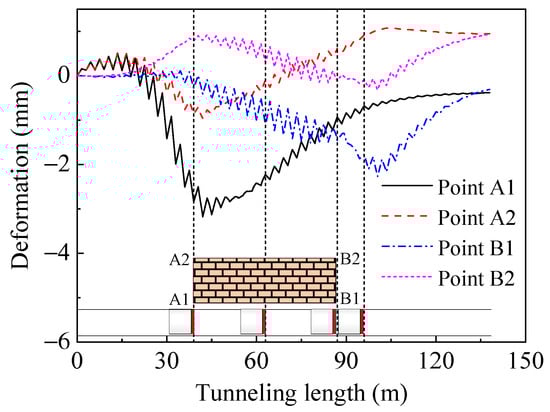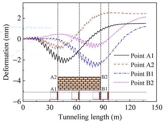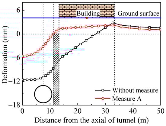 Corresponding settlement troughs are shown in Figure 12. It demonstrates that the surface settlement beneath buildings is significantly reduced and more uniformly distributed compared to that in the scenario without any measures. The unloading of the tunnel causes vertical compression and horizontal expansion of the lining segments, which, in turn, compresses the surrounding soil and results in upward bulging of the soil on the side away from the tunnel.