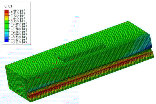 The measured data, as presented in Figure 11, were compared with the settlement calculated from the FE model. The numerical model demonstrates a strong correlation with the measured data, both in terms of the trend of deformation development and the magnitude of the deformation amplitudes. Taking into account the characteristics of this simplified three-dimensional FE model and the inherent uncertainties associated with in situ measurement activities, the predicted values are found to be within a reasonable range. Consequently, the model established in this study is deemed reliable for conducting settlement analyses.