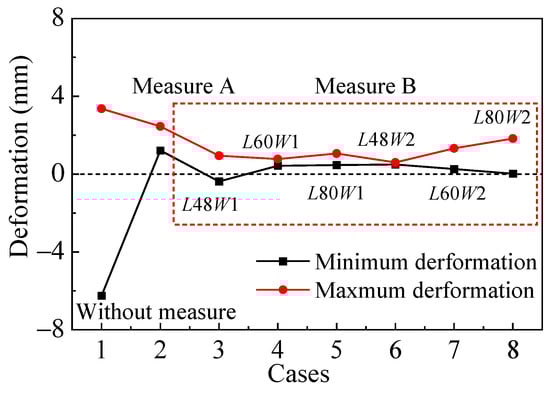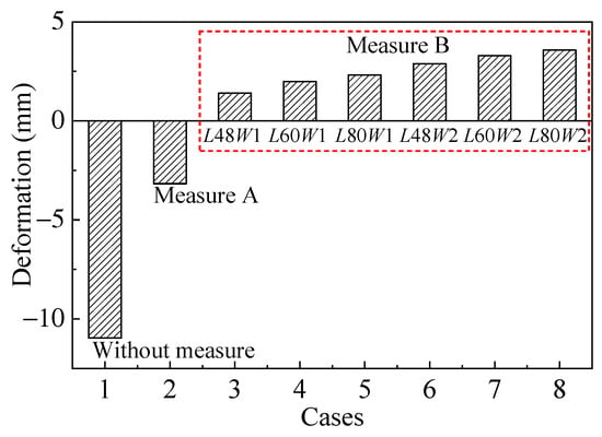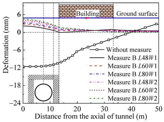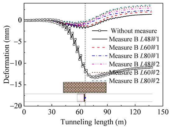A comparison of the final deformation results for the building under different conditions is shown in Figure 21. As can be seen in this figure, the tunnel construction causes noticeable subsidence on one side of the surface building; after measures are taken, the subsidence of the building is restrained significantly, and the subsidence or uplift at the point of the minimum deformation of the building is close to zero. When the portal partition method is used for reinforcement of the stratum, the deformation of the building does not change much with an increase in the length and thickness of the reinforcement, which is lower overall than that when using the vertical isolation method.