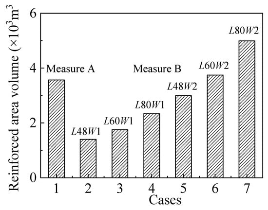 The extent of stratum reinforcement can be quantified by the volume of reinforcement material used. Figure 23 illustrates how this volume varies under different conditions. It is clear that increasing both the length and thickness of the portal partition results in a significant rise in the volume and cost of the reinforcement material. However, the stratum reinforcement under the L60W2 scenario remains relatively similar to that when using the vertical partition method. Therefore, using the portal partition method to manage deformation in adjacent structures not only enhances the effectiveness of the reinforcement but also leads to a substantial reduction in costs.