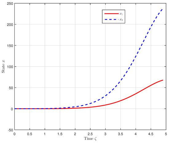 We chose the ITVD and the initial conditions provided in Example 1, where Figure 2 shows the time evolution of without control. It demonstrates that the open-loop system is not finite-time-stable, as the states diverge over time.