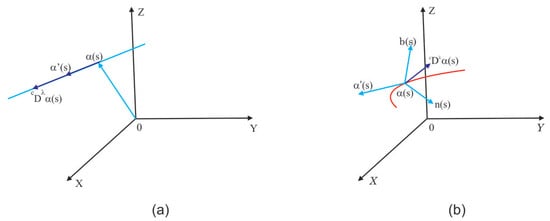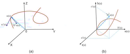 Figure 1a shows the vector tangent to the curve at s, as well as the fractional derivative vector , which is not necessarily tangent to at s. Figure 1b expresses the vector as a linear combination of the basis given by the Frenet–Serret trihedron.