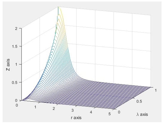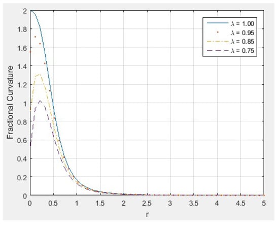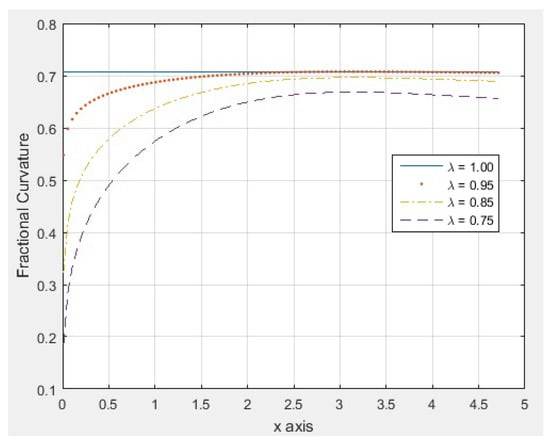 Figure 9 indicates the behavior of plot of the function for different values of and . From Figure 9, we can observed that if λ approaches 1, the plot of the function approaches the plot of the classic curvature .