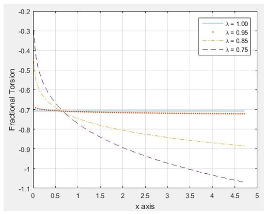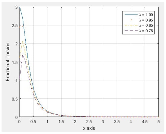 Figure 10 indicates the behavior of plot of the function for different values of and . From Figure 10, we can observed that if λ approaches 1, the plot of the function approaches the plot of the classic torsion .
