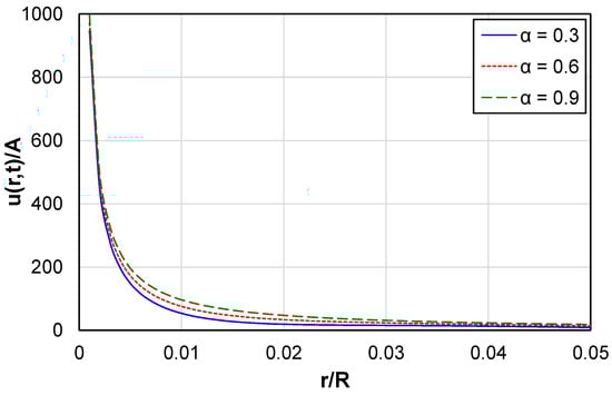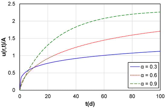 where is the generalized diffusion coefficient (m2/sα). The Caputo fractional derivative has been used in [] and, therein, it has been shown that the use of FOD predicts the groundwater flow better in cylindrical coordinates based on experimental data. Diluted pollutants may obey a similar diffusion differential equation to the one in []. The CFD will be considered instead of the other fractional derivatives due to its simplicity, explicitness, and easiness in this study to find an analytical solution that is easier than the one given in []. If the CFD replaces the FOD in Equation (3), the following diffusion equation is obtained: