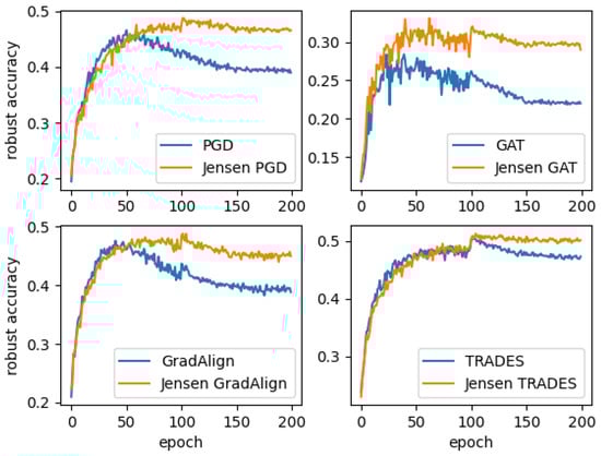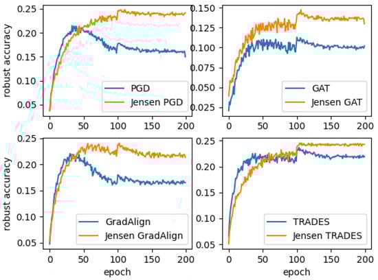 The robustness accuracy curve of the model on four benchmark model experiments associated with CIFAR-10 dataset. Based on the robust accuracy curve, it can be seen that the newly proposed method in this paper has significant advantages in robust accuracy and also improves the stability of training.
