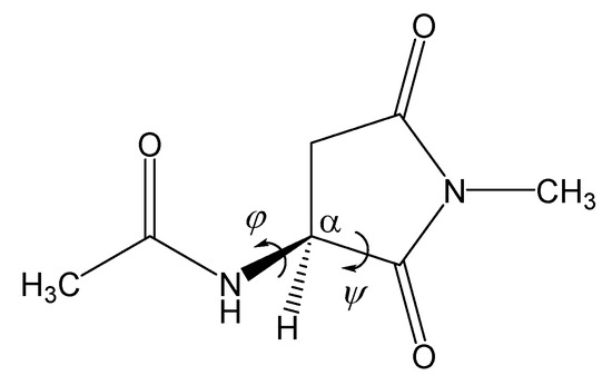 The model molecule used for calculation in this present study. The α carbon atom (Cα) is in the l-configuration. The symbols φ and ψ represent the C–N–Cα–C and N–Cα–C–N dihedral angles, respectively, corresponding to the main chain of the original Asp or Asn residue.
