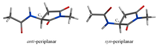For the model molecule, two conformers (Figure 2) were found that have almost the same energies. These two conformers can be denoted as anti-periplanar and syn-periplanar with respect to the Cα–Hα bond and the adjacent N–H bond. In the anti-periplanar conformer, the Hα–Cα–N–H dihedral angle is −171° and the φ dihedral angle (Figure 1) is −106°. In the syn-periplanar conformer, the Hα–Cα–N–H dihedral angle is −12° and φ = 54°. The syn-periplanar conformer is only 0.9 kJ mol−1 lower than the anti-periplanar conformer. Here, a low-energy stereoinversion pathway from the anti-periplanar conformer is reported. Hereafter, the anti-planar conformer of the model compound in the l-form is denoted as R (reactant). The product (denoted as P) is the syn-periplanar conformer of the stereoinverted d-form of the model molecule. The overall energy diagram is shown in Figure 3.