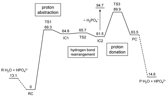The reaction starts from the reactant complex (RC) shown in Figure 4. The RC is a complex between R, an HPO42− ion, and an H2O molecule. In order to roughly estimate the stabilization energy of R by complexing with an HPO42− ion in water, the geometries of the R∙H2O complex and the HPO42− ion were separately optimized. The sum of energies of these two species was 13.1 kJ mol−1 higher than the RC (Figure 3).