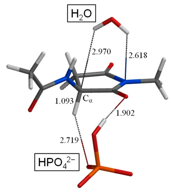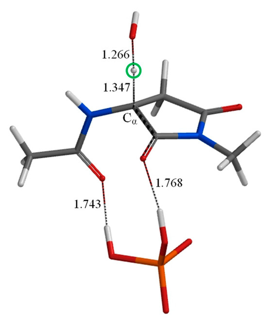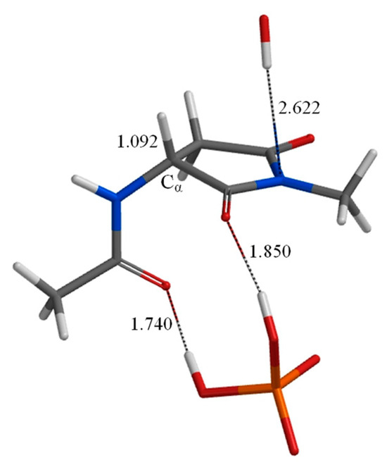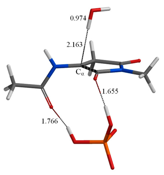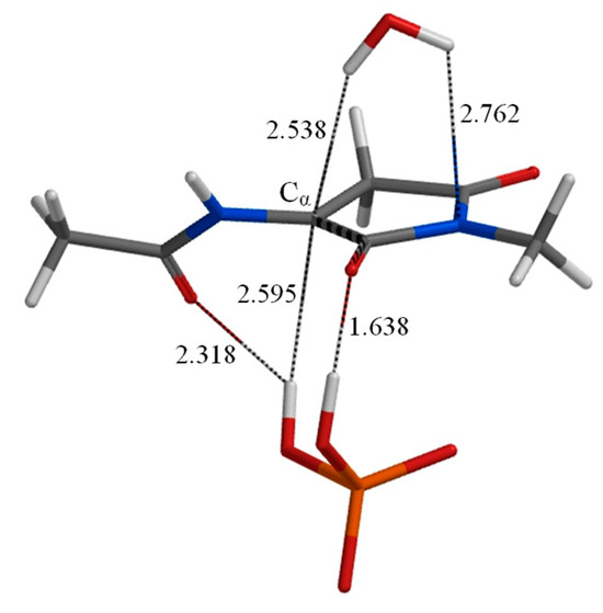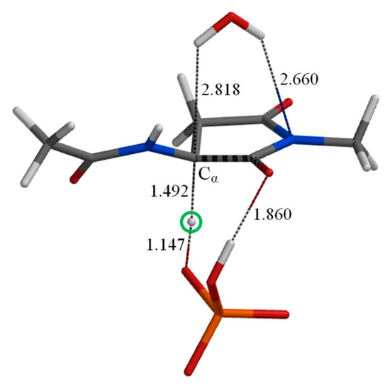 IC2 (intermediate complex 2), shown in Figure 8, is directly connected to TS2. The energy of IC2 is lower than IC1 by 3.3 kJ mol−1 and is higher than the RC by 61.5 kJ mol−1. The anionic hydrogen bond between Cα and the phosphate has been broken (3.519 Å) in IC2. On the other hand, a new hydrogen bond has been created between the acetyl oxygen and the phosphate (1.766 Å). Moreover, the interaction between Cα and the water hydrogen atom has become considerably shorter (2.163 Å). The Cα atom is now ready to abstract a proton from the H2O molecule. In other words, the H2O molecule is now ready to donate a proton to the Cα atom.