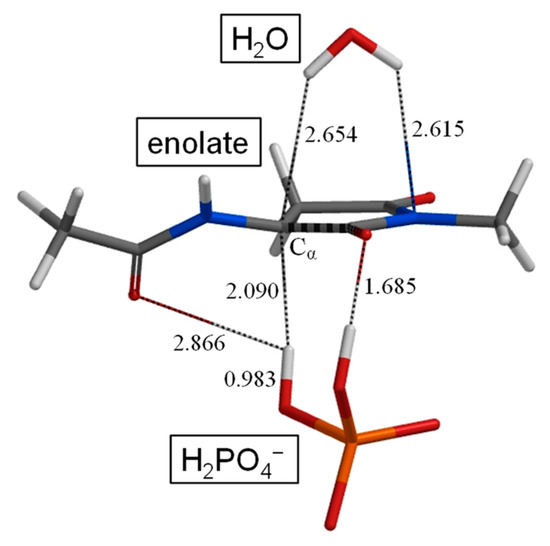 TS3 (transition state 3), shown in Figure 9, is the TS of the third step. This TS is for the proton donation from H2O to the Cα atom of IC2. The H2PO4− ion produced in the first step remains bound to the enolate intermediate in this step. In TS3, the distance of the breaking O–H bond is 1.266 Å, while the distance of the forming Cα–H bond is 1.347 Å. The local energy barrier of the third step is 28.4 kJ mol−1, and the overall reaction barrier from the RC is 89.9 kJ mol−1. This value is consistent with a slow reaction occurring in vivo, suggesting that the present reaction pathway actually operates in vivo.