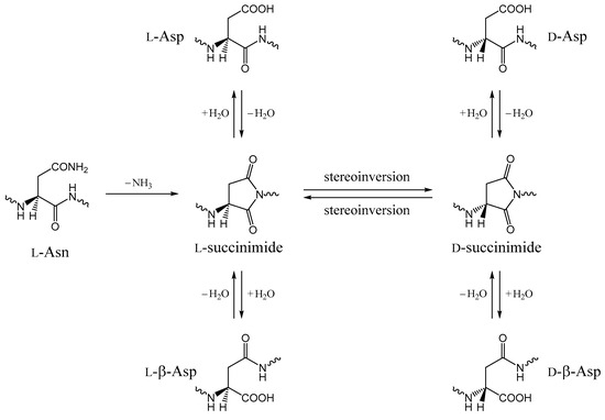Aspartic acid (Asp) residues are unstable stereochemically. This is due to the succinimide-linked mechanism shown in Scheme 1 [22,23,24,25,26,27]. The l-Asp residue can undergo nonenzymatic and spontaneous cyclization to the five-membered ring l-succinimide intermediate with the release of a water molecule. The l-succinimide may be intramolecularly hydrolyzed back to l-Asp or to l-β-Asp. Moreover, since the succinimide residue is prone to a catalyzed stereoinversion, l-succinimide may be converted to d-succinimide, from which d-Asp and d-β-Asp residues can be produced. The formation of the unusual l-β-Asp, d-Asp, and d-β-Asp residues can affect the protein structures and functions [28,29,30]. Succinimide intermediates can also be formed from the asparagine (Asn) residues triggering the reactions known as deamidation [22,23,31]. This is irreversible because of the release of an ammonia molecule. Therefore, there can be l-β-Asp, d-Asp, and d-β-Asp residues in proteins originating from Asn residues. It should be noted that the actual species that directly undergoes stereoinversion is the succinimide intermediate. In this present paper, I focus on the stereoinversion of the succinimide intermediate.