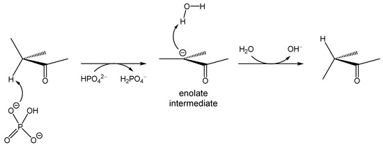 The proton donation in the third step occurs while the H2PO4− ion produced in the first step remains bound to the enolate intermediate. Therefore, the two sides of the enolate plane are not symmetrical, although the enolate has a flat geometry. The presently found novel mechanism can be termed the “unsymmetrical SE1” or “pseudo-SE2” mechanism.