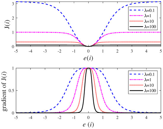 Since the error signal is a complex value, the curves of cost function for can be seen in Figure 2. It is easily found that the cost function with a large value of λ can restrain the outlier from the non-Gaussian noise of each node. Moreover, the links of the cost function have obvious symmetry for both positive and negative errors.