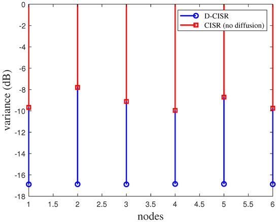 The balanced and unbalanced three-phase systems are considered to verify the superiority of our algorithms based on the distributed networks in the first experiment. To make a fair comparison between diffusion and non-diffusion algorithms, we set the same step size and the parameter for both D-CISR and CISR algorithms. Moreover, the system frequency is , and the initial frequency estimation is . With the sampling frequency , the variances are calculated by (40) and (41). Thus, those behaviors of balanced three-phase system can be seen in Figure 4.
